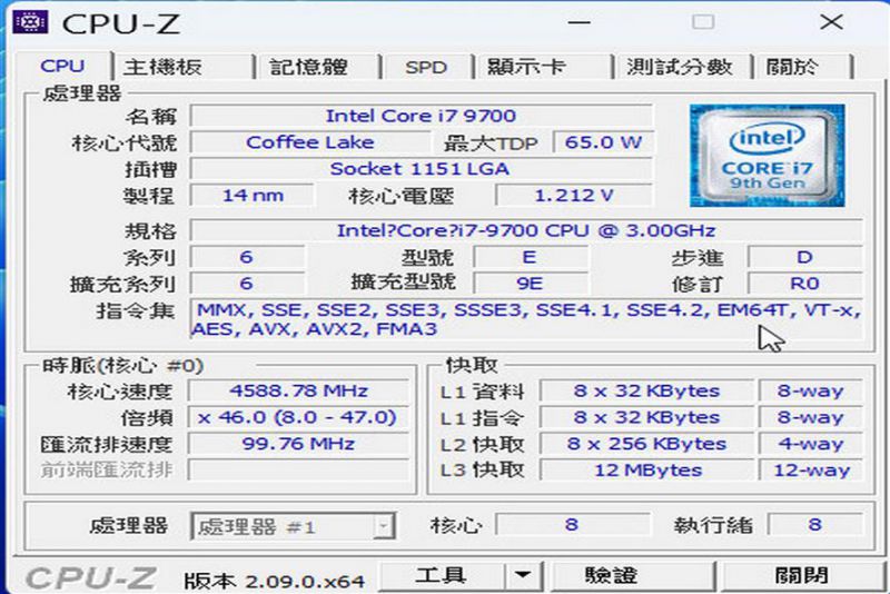 處理器--Intel i7-9700 3.00GHz/12MB 1151腳位 八核八緒處理器